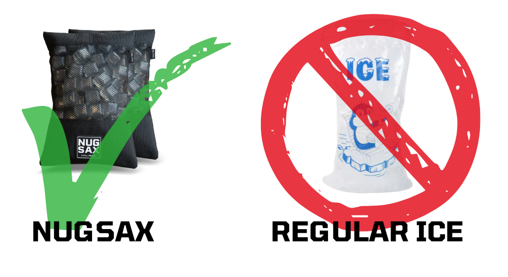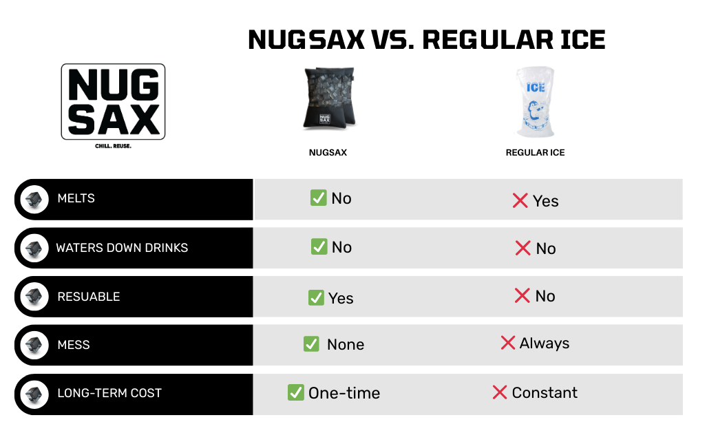 ICE PACKS AREN’T MUCH BETTER. THEY’RE BULKY, LEAK OVER TIME, AND AREN’T MEANT FOR DRINKS. THAT’S WHY PEOPLE SEARCH FOR REUSABLE ICE CUBES, AND THAT’S EXACTLY WHERE NUGSAX PREMIUM BAGGED ICE CUBES COME IN.
